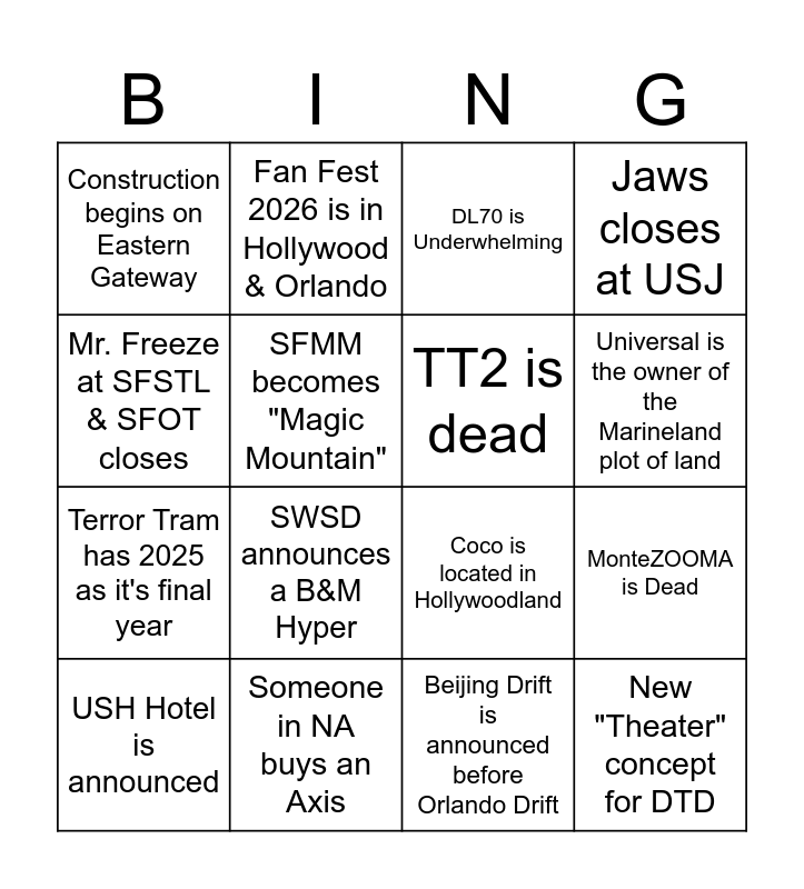 This bingo card has 18 words: SWSD announces a B&M Hyper, New "Theater" concept for DTD, DL70 is Underwhelming, Construction begins on Eastern Gateway, Coco is located in Hollywoodland, Jaws closes at USJ, USH Hotel is announced, Fan Fest 2026 is in Hollywood & Orlando, Universal is the owner of the Marineland plot of land, Terror Tram has 2025 as it's final year, Beijing Drift is announced before Orlando Drift, Mr. Freeze at SFSTL & SFOT closes, MonteZOOMA is Dead, SFMM becomes "Magic Mountain", TT2 is dead, Disney uses Generative AI for theme parks, Someone in NA buys an Axis and An Intamin "Danse Macabre" style attraction is announced for NA.