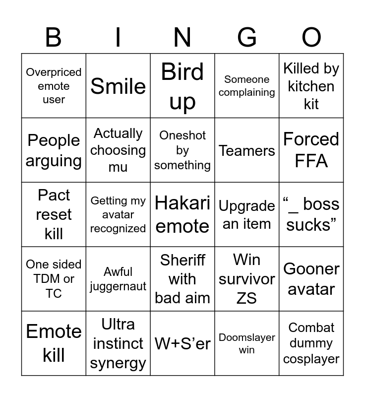 This bingo card has a free space and 24 words: Awful juggernaut, Ultra instinct synergy, Oneshot by something, Emote kill, Killed by kitchen kit, Overpriced emote user, People arguing, Smile, Upgrade an item, Sheriff with bad aim, Teamers, Pact reset kill, Win survivor ZS, Gooner avatar, Actually choosing mu, Doomslayer win, “_ boss sucks”, Bird up, Forced FFA, Getting my avatar recognized, Combat dummy cosplayer, One sided TDM or TC, Someone complaining and W+S’er.