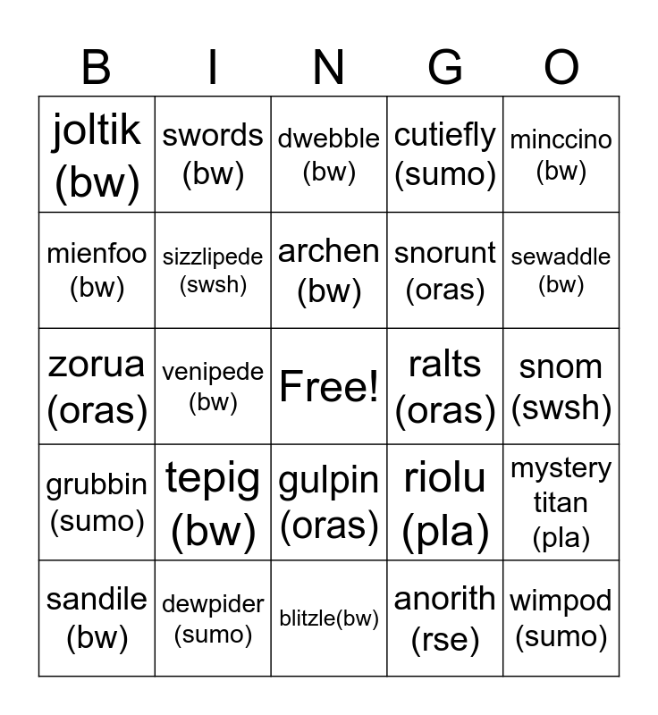 This bingo card has a free space and 25 words: tepig (bw), blitzle(bw), archen (bw), sandile (bw), minccino (bw), joltik (bw), mienfoo (bw), swords (bw), ralts (oras), gulpin (oras), snorunt (oras), zorua (oras), riolu (pla), mystery titan (pla), sizzlipede (swsh), blipbug (swsh), snom (swsh), dwebble (bw), sewaddle (bw), venipede (bw), wimpod (sumo), dewpider (sumo), grubbin (sumo), cutiefly (sumo) and anorith (rse).