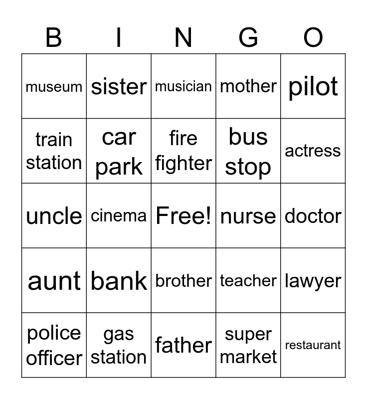 This bingo card has a free space and 24 words: bank, gas station, fire fighter, police officer, pilot, museum, train station, sister, nurse, brother, bus stop, uncle, teacher, lawyer, car park, super market, doctor, musician, actress, cinema, restaurant, aunt, mother and father.