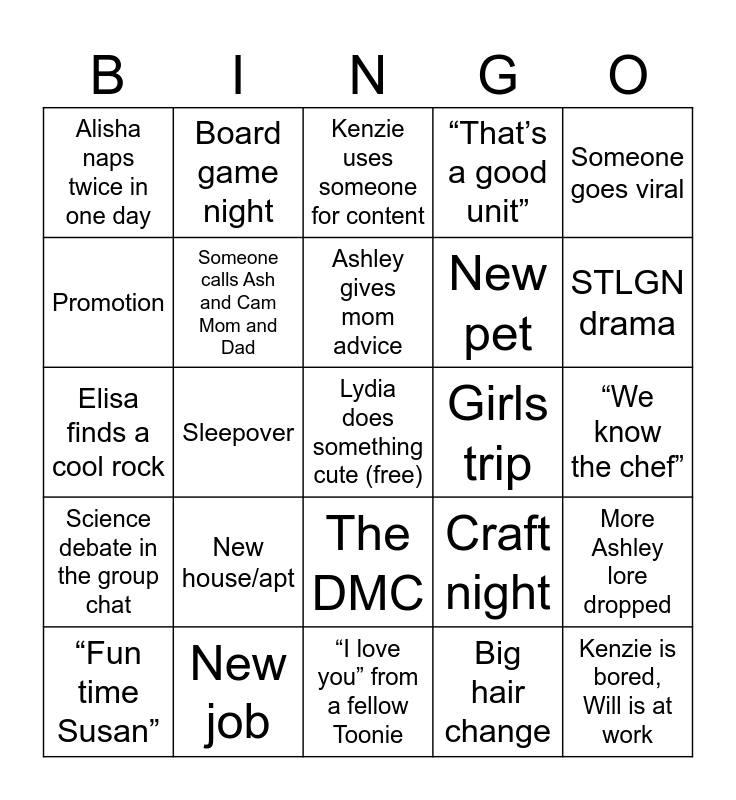 This bingo card has a free space and 24 words: New house/apt, New job, Ashley gives mom advice, “Fun time Susan”, Someone goes viral, Alisha naps twice in one day, Promotion, Board game night, Girls trip, The DMC, New pet, Elisa finds a cool rock, Craft night, More Ashley lore dropped, Someone calls Ash and Cam Mom and Dad, Big hair change, “We know the chef”, Kenzie uses someone for content, STLGN drama, Sleepover, Kenzie is bored, Will is at work, Science debate in the group chat, “That’s a good unit” and “I love you” from a fellow Toonie.