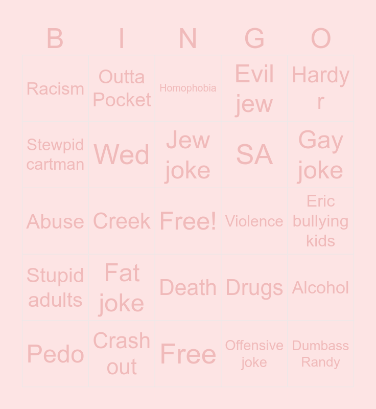 This bingo card has a free space and 24 words: Fat joke, Crash out, Jew joke, Pedo, Hardy r, Racism, Stewpid cartman, Outta Pocket, Violence, Death, SA, Abuse, Drugs, Alcohol, Wed, Offensive joke, Eric bullying kids, Homophobia, Gay joke, Creek, Dumbass Randy, Stupid adults, Evil jew and Free.