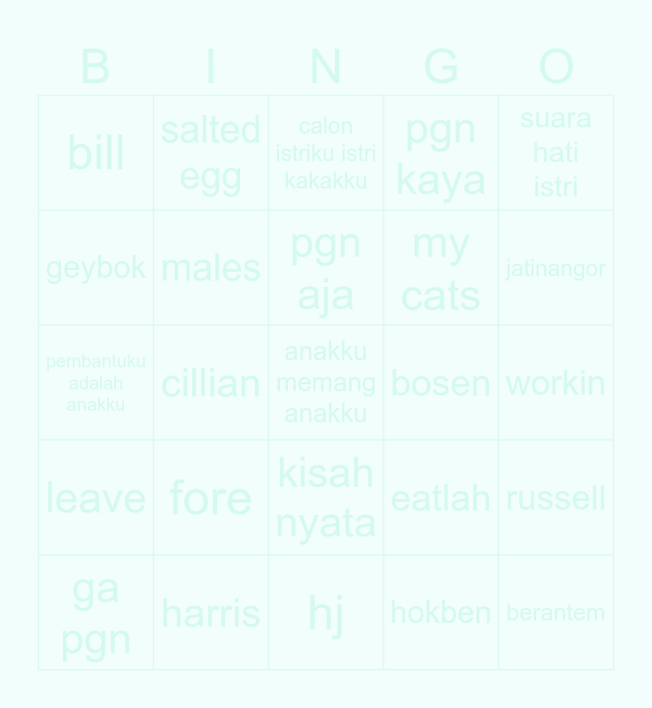 This bingo card has 25 words: fore, hj, pgn aja, ga pgn, suara hati istri, bill, geybok, salted egg, bosen, kisah nyata, my cats, pembantuku adalah anakku, eatlah, russell, males, berantem, workin, calon istriku istri kakakku, jatinangor, cillian, anakku memang anakku, harris, leave, pgn kaya and hokben.