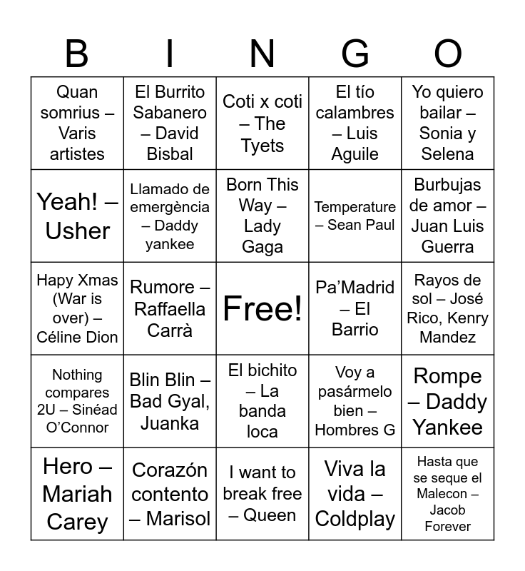 This bingo card has a free space and 123 words: La Niña - María Peláe, Caminando por la vida - Melendi, Fantastic Shine - Love of Lesbian, Potra Salvaje - Isabel Aaiún, La gasolina – Daddy Yankee, A quién le importa – Alazka y Dinarama, El Burrito Sabanero – David Bisbal, Rasputin – Boney M., I want to break free – Queen, Torero – Chayanne, Salomé – Chayanne, Solo se vive una vez – Azucar Moreno, Bailar pegados – Sergio Dalma, La, La, LA – Masiel, Waterloo – ABBA, Mamma Mia – ABBA, Hero – Mariah Carey, Without You – Harry Nilsson, Love Boat Theme – Dominik Hauser, Titanium – David Getta, Sia, Viva la vida – Coldplay, Born This Way – Lady Gaga, Texas Hold’em – Beyoncé, Estando contigo – Marisol, Vivo cantando – Salomé, El tío calambres – Luis Aguile, Corazón contento – Marisol, Breakfast in America – Supertramp, Another brick in the wall, Pt 2 – Pink Floyd, Twist and Shout – The Beatles, En mi corazón estaràs – Phill Collins, Merche Macaria, Hapy Xmas (War is over) – Céline Dion, Nothing compares 2U – Sinéad O’Connor, 19 días y 500 noches – Joaquín Sabina, Vivir así es morir de amor – Camilo Sesto, Un beso y una flor – Nino Bravo, Libre – Nino Bravo, Majaros de Barro – Manolo Garcia, Como un burro armado en la Puerta del baile – El último de la fila, Por la raja de tu falda – Estopa, Voy a pasármelo bien – Hombres G, Una rosa es un rosa – Mecano, El Run Run – Estopa, Rosario, Sabor de Amor – Danza invisible, Mediterraneo – Joan Manuel Serrat, Thriller – Michael Jackson, Yo perreo sola – Bad Bunny, Si antes te hubiera conocido – Karol G, Houdini – Dua Lipa, Blin Blin – Bad Gyal, Juanka, Mafiosa – Nathy Peluso, La santa – Lola Indigo, Soltera – Shakira, TQG – Karol G, Shakira, Vagabundo – Sebastian Yatra, Baby Shark – Pinkfong, Hijo del hombre – Phill Collins, Hakuna Matata – El Rey León, Livin’ la vida loca – Ricky Martin, La mordidita – Ricky Martin, Youtel, Let’s get loud – Jennifer Lopez, El anillo – Jennifer Lopez, Yo no bailo con Juana – Latin Express, Tacones Rojos – Sebastian Yatra, La sevillana – Omar Montes, Pa’Madrid – El Barrio, Bamboléo – Gipsy Kings, Macarena – Los del Rio, Rayos de sol – José Rico, Kenry Mandez, La fiesta – Pedro Capó, El aguacate es potasio (La sicopata) – Hey Santana, Los Porros no – El Jincho, Coti x coti – The Tyets, La marina sta morena – Figa Flawas, La platja – Stay Homas, The Tyets, Aquí es Nadal i estic content – La Pegatina, Por la boca vive el pez – Fito y Fitipaldis, Yo quiero bailar – Sonia y Selena, Bicho malo pille – La banda del capitán Canalla, Salta – Seguridad Social, Sobreviviré – Monica Naranjo, Corazón Latino – David Bisbal, Rompe – Daddy Yankee, Yeah! – Usher, Survivor – Destiny’s child, Mi reina – Henry Mendez, Temperature – Sean Paul, Arrasando – Thalia, Dile – Don Omar, Estrellita de Madrugada – Omega, Daddy Yankee, Boom Booom – Chayanne, Dale Don Dale – Don Omar, Llamado de emergència – Daddy yankee, Hasta que se seque el Malecon – Jacob Forever, El telefono – Héctor “El Father”, Wisin & Yandel, Fulanito – Becky G, El Alfa, La Historia – El Taiger, DJ Conds, Party in the U.S.A – Miley Cyrus, Doctor (Work it Out) – Pharrell Williams, Miley Cyrus, I’m coming out – Diana Ross, El bichito – La banda loca, Me maten – C. Tangana, Quan somrius – Varis artistes, Dos gardènies – Antonio Machín, Suga – Maroon 5, Dramas y comèdies, Rumore – Raffaella Carrà, Pedro – Nancys Rubias, Física o química – Despistaos, Quédate – Bizarrap, Quevedo, Milionària – Rosalía, Malamente – Rosalía, Ateo – C.Tangana, Nathy Peluso, Despechá - Rosalía, Ropa Cara – Camilo, Vida de rico – Camilo, Una vaina loca – Fuego, Mientras em curo del cora – Karol G, Una vaina loca – Fuego, Rakata – Wisin & Yandel, El niágara en bicicleta – Juan Luis Guerra, Burbujas de amor – Juan Luis Guerra and Cuando zarpa el amor - Camela.