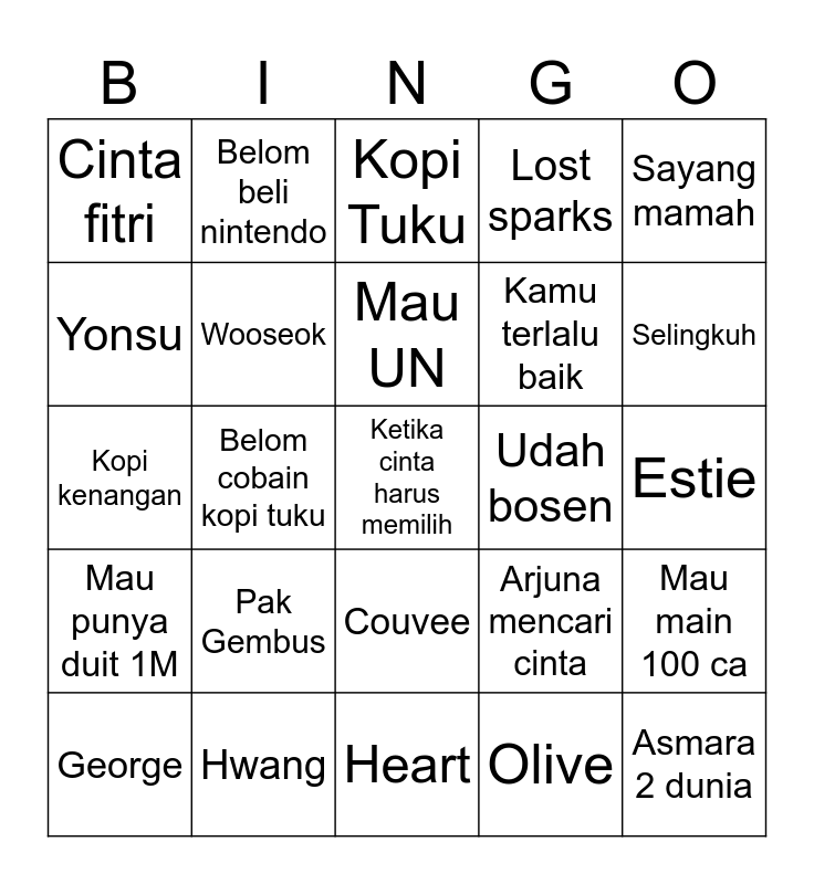 This bingo card has 25 words: Pak Gembus, Heart, Mau UN, George, Sayang mamah, Cinta fitri, Yonsu, Belom beli nintendo, Udah bosen, Couvee, Kamu terlalu baik, Kopi kenangan, Arjuna mencari cinta, Mau main 100 ca, Wooseok, Asmara 2 dunia, Estie, Kopi Tuku, Selingkuh, Belom cobain kopi tuku, Ketika cinta harus memilih, Hwang, Mau punya duit 1M, Lost sparks and Olive.