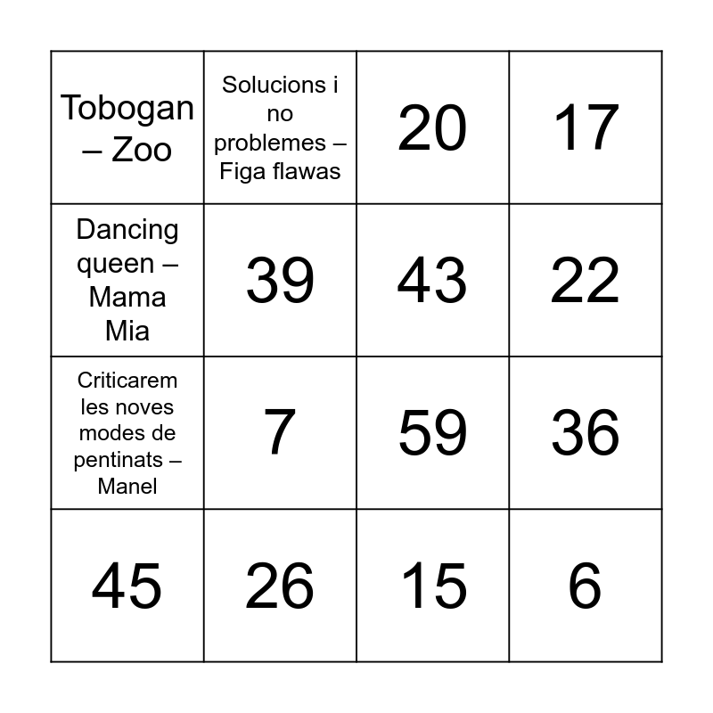 This bingo card has 116 words: 1, 16, 31, 46, 61, 2, 17, 32, Free!, 47, 62, 3, 18, 48, 63, 4, 19, 33, 49, 64, 5, 20, 34, 50, 65, 6, 21, 35, 51, 66, 7, 22, 36, 52, 67, 8, 23, 37, 53, 68, 9, 24, 38, 54, 69, 10, 25, 39, 55, 70, 11, 26, 40, 56, 71, 12, 27, 41, 57, 72, 13, 28, 42, 58, 73, 14, 29, 43, 59, 74, 15, 30, 44, 60, 75, 45, Lola la tavernera – Portbo, Tobogan – Zoo, Benvolgut – Manel, Declaració de principis – La iaia, Duro de verdad pt. 2 remix – Fr4n F3rr3r, Solucions i no problemes – Figa flawas, El conjuntito – Bobe & Omar montes, Cuidado – Eskorbuto, Criticarem les noves modes de pentinats – Manel, El conte de Nova York – Gossos, Madre tierra – Chayannne, Nino gramo – Manlo Kabezabolo, Ama ama ama, y ensalcha el alma – Extremoduro, Ca com va – Inadaptats, Buenos genes – Rels B & Dellafuente, Quedate – Quevedo & Bzrp, La meva sort – Ginestà, Hibiki – Bad Bunny & Mora, Dancing queen – Mama Mia, Hay que venir al sur – Raffaella Carrá, El chacachá del tren – El Consorcio, Miami beach – Lax’n’busto, L’empordà – Sopa de cabra, Chica ye ye – Concha Velasco, Libre – Nino Bravo, 20 de enero – La oreja de Van Gogh, Ni una sola palabra – Paulina Rubio, Marta, Sebas, Guille y los demàs – Amaral, Amigos para siempre – Los Manolos, La casa por el tejado – Fito y Fitipaldis, Tequila – The champs, En que estrella estarà – Nena Daconte, Otra noche – Kaotiko, Potra salvaje – Isabel Aaiún, Fisica o química - Despistaos, Aqui no hay playa – The refrescos, Vivir asi es morir de amor – Camilo Sesto, Amante bandido – Miguel Bosé, La canción del velero – La fiesta and Llum, foc, destrucció – BSO Bola de drac.