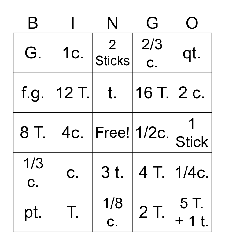 This bingo card has a free space and 24 words: c., T., t., pt., qt., G., f.g., 1c., 1/2c., 3 t., 16 T., 8 T., 4 T., 1/4c., 12 T., 2 T., 1 Stick, 2 Sticks, 2 c., 4c., 5 T. + 1 t., 1/3 c., 2/3 c. and 1/8 c..
