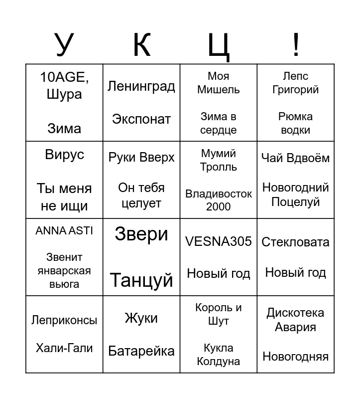 This bingo card has 16 words: Жуки Батарейка, Стекловата Новый год, Моя Мишель Зима в сердце, 10AGE, Шура Зима, ANNA ASTI Звенит январская вьюга, Ленинград Экспонат, VESNA305 Новый год, Король и Шут Кукла Колдуна, Вирус Ты меня не ищи, Руки Вверх Он тебя целует, Леприконсы Хали-Гали, Лепс Григорий Рюмка водки, Звери Танцуй, Чай Вдвоём Новогодний Поцелуй, Мумий Тролль Владивосток 2000 and Дискотека Авария Новогодняя.