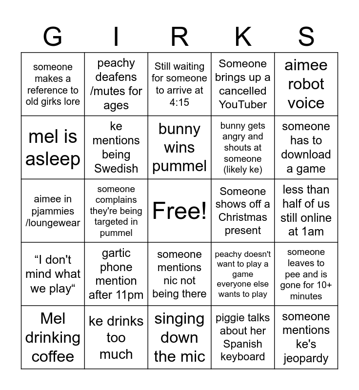 This bingo card has a free space and 24 words: gartic phone mention after 11pm, ke drinks too much, bunny wins pummel, Mel drinking coffee, aimee robot voice, someone makes a reference to old girks lore, mel is asleep, peachy deafens /mutes for ages, Someone shows off a Christmas present, someone mentions nic not being there, bunny gets angry and shouts at someone (likely ke), aimee in pjammies /loungewear, peachy doesn't want to play a game everyone else wants to play, someone leaves to pee and is gone for 10+ minutes, ke mentions being Swedish, piggie talks about her Spanish keyboard, less than half of us still online at 1am, Still waiting for someone to arrive at 4:15, someone has to download a game, someone complains they're being targeted in pummel, someone mentions ke's jeopardy, “I don't mind what we play“, Someone brings up a cancelled YouTuber and singing down the mic.