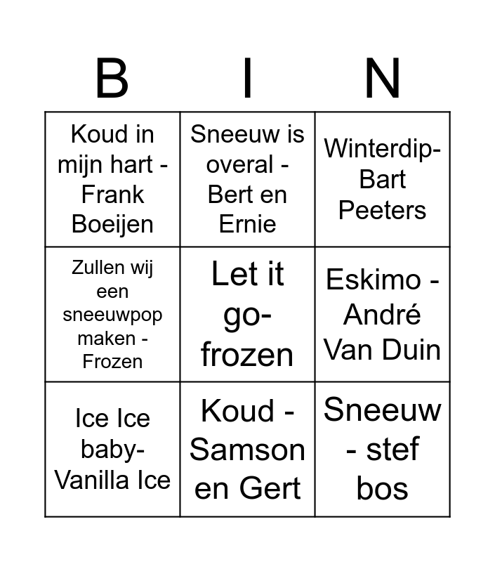 This bingo card has 13 words: Let it snow! Frank Sinatra, Mijn winterroosje - Will Tura, Ice Ice baby-Vanilla Ice, Sneeuw is overal - Bert en Ernie, Zullen wij een sneeuwpop maken - Frozen, Let it go- frozen, Sneeuw - stef bos, Ijskoud - Nielson, Koud - Samson en Gert, Koud in mijn hart - Frank Boeijen, Eskimo - André Van Duin, Winterdip- Bart Peeters and A hazy shade of winter - the bangels.
