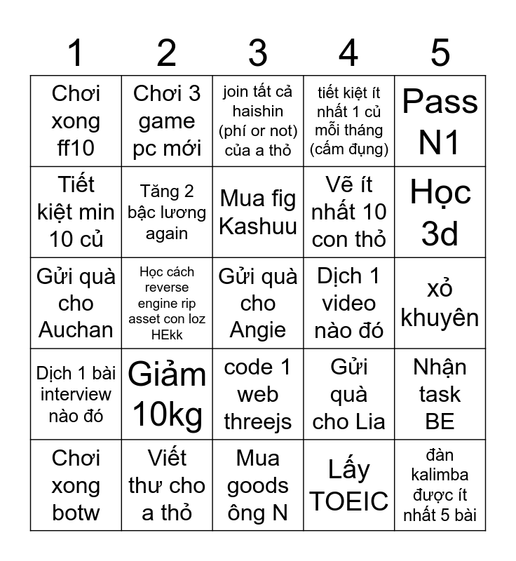 This bingo card has a free space and 24 words: Giảm 10kg, Viết thư cho a thỏ, Mua fig Kashuu, Chơi xong botw, Pass N1, Chơi xong ff10, Tiết kiệt min 10 củ, Chơi 3 game pc mới, Dịch 1 video nào đó, code 1 web threejs, Vẽ ít nhất 10 con thỏ, Gửi quà cho Auchan, Gửi quà cho Lia, Nhận task BE, Tăng 2 bậc lương again, Lấy TOEIC, xỏ khuyên, join tất cả haishin (phí or not) của a thỏ, Học 3d, Học cách reverse engine rip asset con loz HEkk, đàn kalimba được ít nhất 5 bài, Dịch 1 bài interview nào đó, tiết kiệt ít nhất 1 củ mỗi tháng (cấm đụng) and Mua goods ông N.