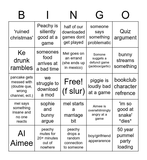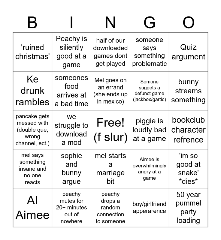 This bingo card has a free space and 24 words: sophie and bunny argue, peachy mutes for 20+ minutes out of nowhere, Mel goes on an errand (she ends up in mexico), AI Aimee, Quiz argument, 'ruined christmas', Ke drunk rambles, Peachy is siliently good at a game, piggie is loudly bad at a game, mel starts a marriage bit, Somone suggets a defunct game (jackbox/gartic), pancake gets messed with (double que, wrong channel, ect.), Aimee is overwhilmingly angry at a game, 'im so good at snake' *dies*, someones food arrives at a bad time, boy/girlfriend apperarence, bookclub character refrence, half of our downloaded games dont get played, bunny streams something, we struggle to download a mod, 50 year pummel party loading, mel says something insane and no one reacts, someone says something problematic and peachy drops a random connection to someone.