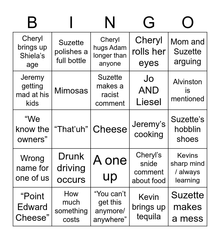 This bingo card has a free space and 29 words: “Point Edward Cheese”, “How’s that”, “That’uh”, Doug/Darla are brought up, Cheryl brings up Shiela’s age, Cheryl hugs Adam longer than anyone, Mimosas, Drunk driving occurs, Jeremy’s cooking, How much something costs, Suzette’s hobblin shoes, Suzette makes a mess, “You can’t get this anymore/ anywhere”, Kevin brings up tequila, Alvinston is mentioned, How smart those kids are, A one up, Wrong name for one of us, Mom and Suzette arguing, “We know the owners”, Cheryl’s snide comment about food, Vegas / Sandy, Jo AND Liesel, Jeremy getting mad at his kids, Cheryl rolls her eyes, Suzette polishes a full bottle, Kevins sharp mind / always learning, Suzette makes a racist comment and “Did you try the…”.