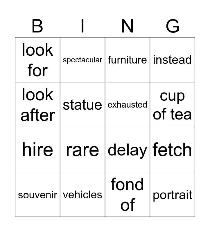 This bingo card has 16 words: vehicles, fetch, furniture, look for, hire, spectacular, delay, fond of, look after, statue, souvenir, instead, rare, cup of tea, exhausted and portrait.