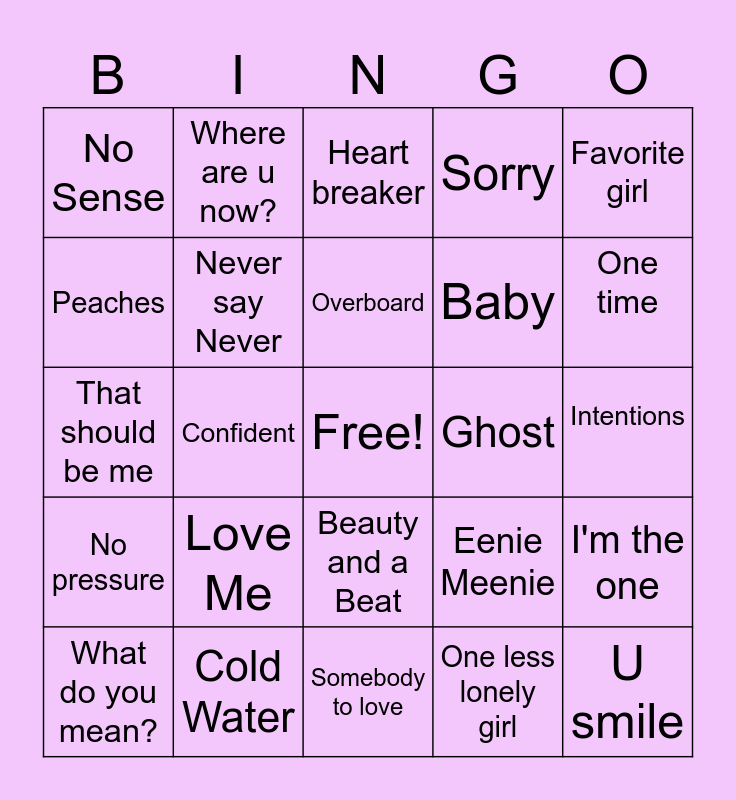 This bingo card has a free space and 24 words: Love Me, Cold Water, Overboard, What do you mean?, Favorite girl, No Sense, Peaches, Where are u now?, Ghost, Beauty and a Beat, Baby, That should be me, Eenie Meenie, I'm the one, Never say Never, One less lonely girl, Intentions, Heart breaker, One time, Confident, U smile, No pressure, Sorry and Somebody to love.