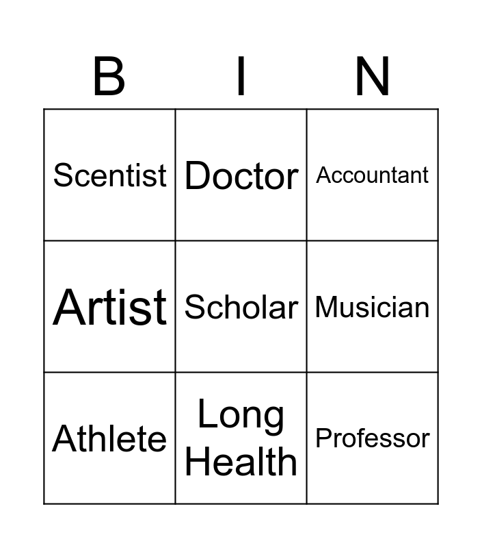 This bingo card has 12 words: Lawyer, Professor, Scholar, Musician, Doctor, Accountant, Long Health, Race Car Driver, Scentist, Artist, Athlete and Wealthy.