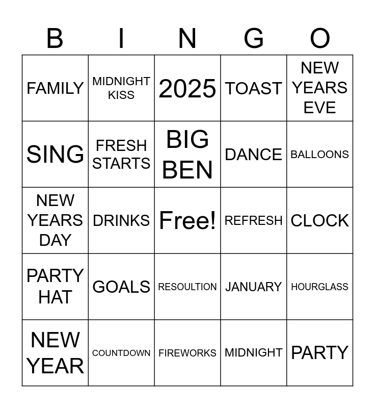 This bingo card has a free space and 29 words: NEW YEAR, CELEBRATE, DRINKS, FOOD, FAMILY, 2025, FRESH STARTS, GOALS, REFRESH, COUNTDOWN, CLOCK, PARTY, FIREWORKS, MIDNIGHT, BALLOONS, CONFETTI, RESOULTION, PARTY HAT, NEW YEARS EVE, NEW YEARS DAY, JANUARY, MUSIC, DANCE, SING, TOAST, MIDNIGHT KISS, HOURGLASS, BIG BEN and TIME.