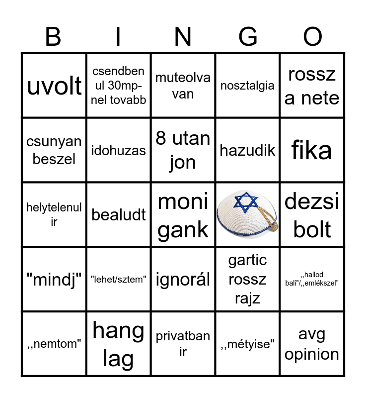 This bingo card has 1 images, a free space and 23 words: "lehet/sztem", hang lag, 8 utan jon, ,,nemtom", rossz a nete, uvolt, csunyan beszel, csendben ul 30mp-nel tovabb, ignorál, hazudik, helytelenul ir, gartic rossz rajz, ,,hallod bali"/,,emlékszel", idohuzas, ,,métyise", dezsi bolt, muteolva van, fika, bealudt, avg opinion, "mindj", nosztalgia and privatban ir.