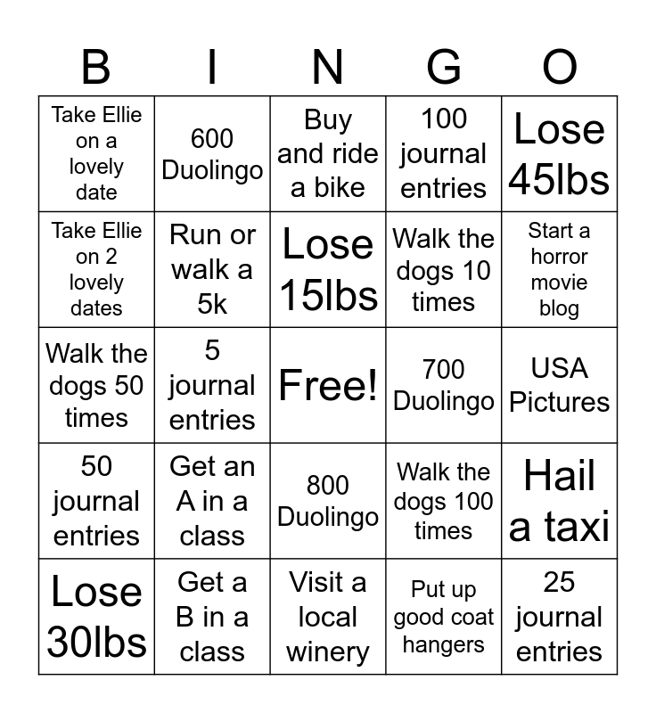 This bingo card has a free space and 24 words: Get an A in a class, Get a B in a class, Lose 15lbs, Lose 30lbs, Lose 45lbs, Take Ellie on a lovely date, Take Ellie on 2 lovely dates, 600 Duolingo, 700 Duolingo, 800 Duolingo, Walk the dogs 10 times, Walk the dogs 50 times, Walk the dogs 100 times, Hail a taxi, Run or walk a 5k, Put up good coat hangers, USA Pictures, Buy and ride a bike, Start a horror movie blog, 5 journal entries, 25 journal entries, 50 journal entries, 100 journal entries and Visit a local winery.