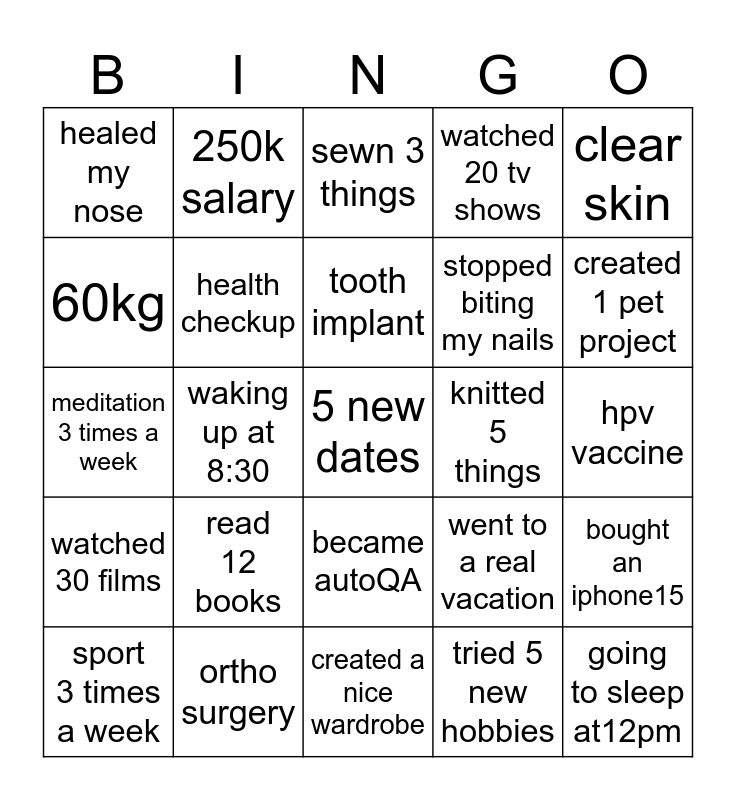 This bingo card has a free space and 24 words: read 12 books, ortho surgery, tooth implant, sport 3 times a week, clear skin, healed my nose, 60kg, 250k salary, knitted 5 things, became autoQA, stopped biting my nails, meditation 3 times a week, went to a real vacation, bought an iphone15, health checkup, tried 5 new hobbies, hpv vaccine, sewn 3 things, created 1 pet project, waking up at 8:30, going to sleep at12pm, watched 30 films, watched 20 tv shows and created a nice wardrobe.