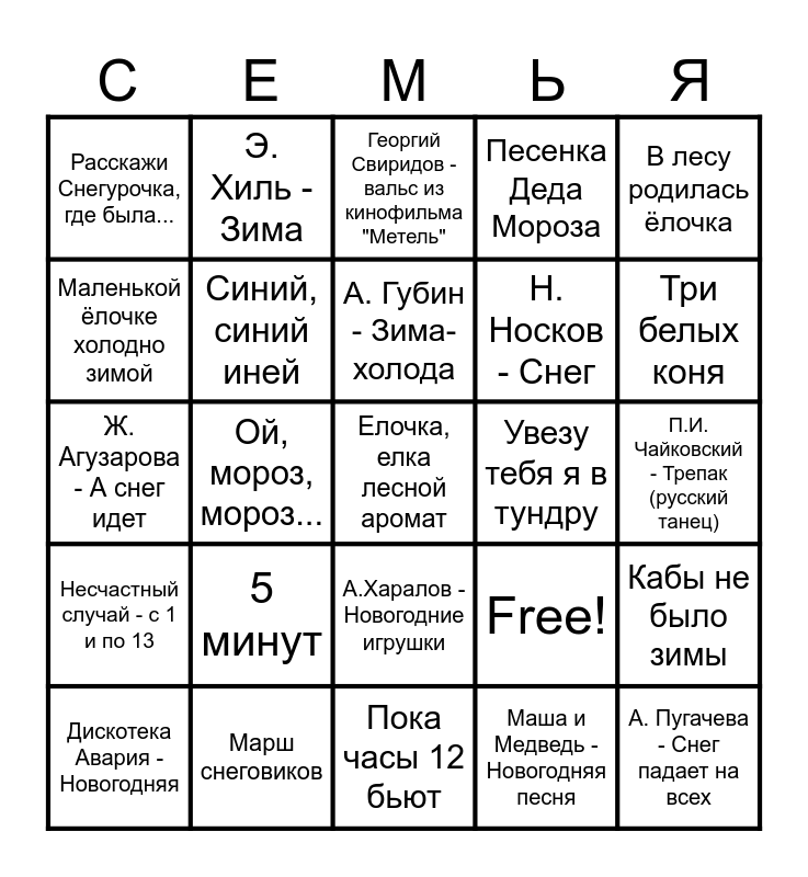 This bingo card has 25 words: 5 минут, Пока часы 12 бьют, А. Губин - Зима-холода, Дискотека Авария - Новогодняя, В лесу родилась ёлочка, Расскажи Снегурочка, где была..., Маленькой ёлочке холодно зимой, Э. Хиль - Зима, Увезу тебя я в тундру, А.Харалов - Новогодние игрушки, Н. Носков - Снег, Ж. Агузарова - А снег идет, Free!, Кабы не было зимы, Синий, синий иней, А. Пугачева - Снег падает на всех, П.И. Чайковский - Трепак (русский танец), Георгий Свиридов - вальс из кинофильма "Метель", Три белых коня, Ой, мороз, мороз..., Елочка, елка лесной аромат, Марш снеговиков, Несчастный случай - с 1 и по 13, Песенка Деда Мороза and Маша и Медведь - Новогодняя песня.