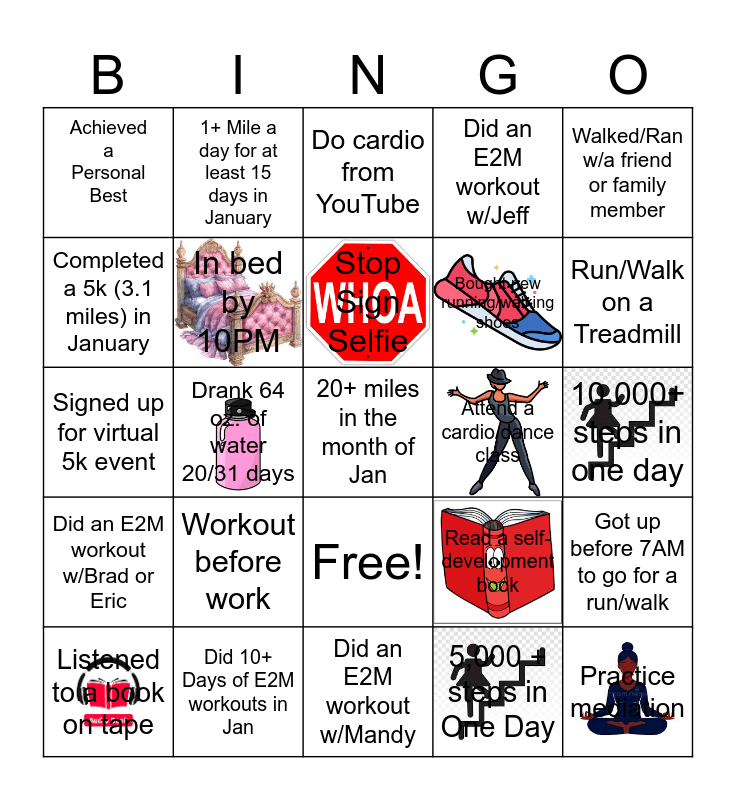This bingo card has 11 images and 26 words: Free!, 5,000 + steps in One Day, Stop Sign Selfie, Did 10+ Days of E2M workouts in Jan, Walked/Ran w/a friend or family member, Achieved a Personal Best, Completed a 5k (3.1 miles) in January, 1+ Mile a day for at least 15 days in January, 10,000+ steps in one day, Read a self-development book, Bought new running/walking shoes, Signed up for virtual 5k event, Got up before 7AM to go for a run/walk, Listened to a book on tape, Drank 64 oz. of water 20/31 days, Stretched/Pilates, Did an E2M workout w/Jeff, Did an E2M workout w/Brad or Eric, Do cardio from YouTube, 20+ miles in the month of Jan, Run/Walk on a Treadmill, Did an E2M workout w/Mandy, Attend a cardio/dance class, Workout before work, In bed by 10PM and Practice mediation.