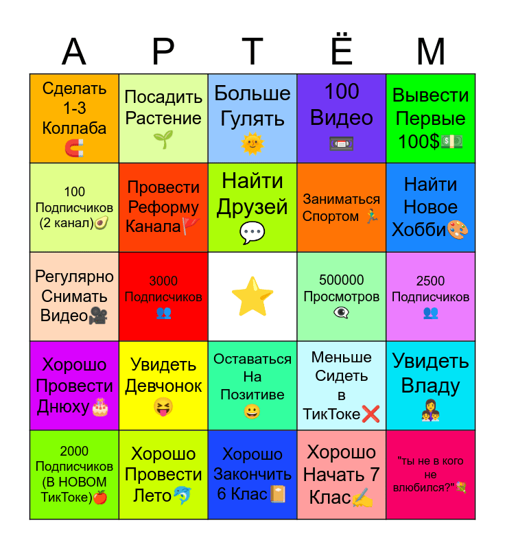 This bingo card has a free space and 24 words: Увидеть Девчонок😝, Хорошо Провести Лето🐬, Найти Друзей💬, 2000 Подписчиков (В НОВОМ ТикТоке)🍎, Вывести Первые 100$💵, Сделать 1-3 Коллаба🧲, 100 Подписчиков (2 канал)🥑, Посадить Растение🌱, 500000 Просмотров👁🗨, Оставаться На Позитивe😀, Заниматься Спортом 🏃♂️, Регулярно Снимать Видео🎥, Меньше Сидеть в ТикТоке❌, Увидеть Владу👩👧👦, Провести Реформу Канала🚩, Хорошо Начать 7 Клас✍, 2500 Подписчиков👥, Больше Гулять🌞, Найти Новое Хобби🎨, 3000 Подписчиков👥, "ты не в кого не влюбился?"💐, Хорошо Провести Днюху🎂, 100 Видео📼 and Хорошо Закончить 6 Клас📔.