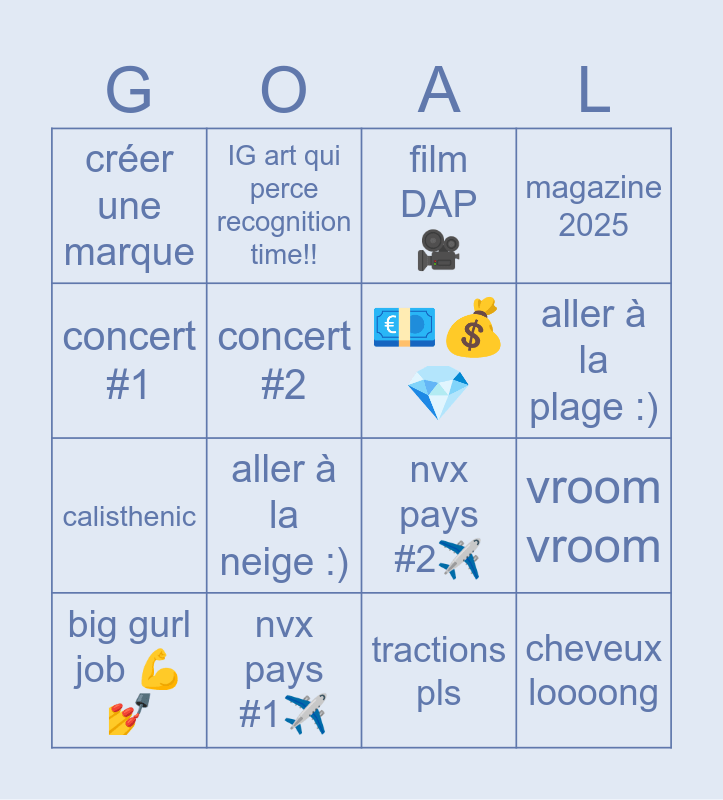 This bingo card has 16 words: big gurl job πͺπ , nvx pays #1βοΈ, film DAP π₯, magazine 2025, concert #1, IG art qui perce recognition time!!, nvx pays #2βοΈ, vroom vroom, crΓ©er une marque, concert #2, tractions pls, aller Γ la plage :), calisthenic, aller Γ la neige :), πΆπ°π and cheveux loooong.