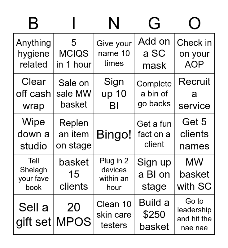 This bingo card has a free space and 24 words: basket 15 clients, 20 MPOS, Sign up 10 BI, Sell a gift set, Check in on your AOP, Anything hygiene related, Clear off cash wrap, 5 MCIQS in 1 hour, Get a fun fact on a client, Plug in 2 devices within an hour, Complete a bin of go backs, Wipe down a studio, Sign up a BI on stage, MW basket with SC, Sale on sale MW basket, Build a $250 basket, Get 5 clients names, Give your name 10 times, Recruit a service, Replen an item on stage, Go to leadership and hit the nae nae, Tell Shelagh your fave book, Add on a SC mask and Clean 10 skin care testers.