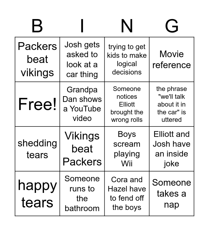 This bingo card has 16 words: Someone runs to the bathroom, Elliott and Josh have an inside joke, trying to get kids to make logical decisions, Packers beat vikings, shedding tears, Josh gets asked to look at a car thing, Boys scream playing Wii, Cora and Hazel have to fend off the boys, Free!, Grandpa Dan shows a YouTube video, happy tears, Movie reference, Vikings beat Packers, the phrase "we'll talk about it in the car" is uttered, Someone notices Elliott brought the wrong rolls and Someone takes a nap.