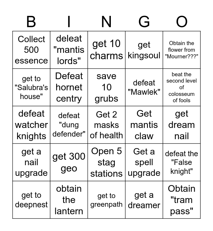 This bingo card has 25 words: get 300 geo, get to greenpath, save 10 grubs, get to deepnest, Obtain the flower from "Mourner???", Collect 500 essence, get to "Salubra's house", deleat "mantis lords", Get mantis claw, Open 5 stag stations, defeat "Mawlek", defeat watcher knights, Get a spell upgrade, defeat the "False knight", Defeat hornet centry, Obtain "tram pass", get dream nail, get 10 charms, beat the second level of colosseum of fools, defeat "dung defender", Get 2 masks of health, obtain the lantern, get a nail upgrade, get kingsoul and get a dreamer.