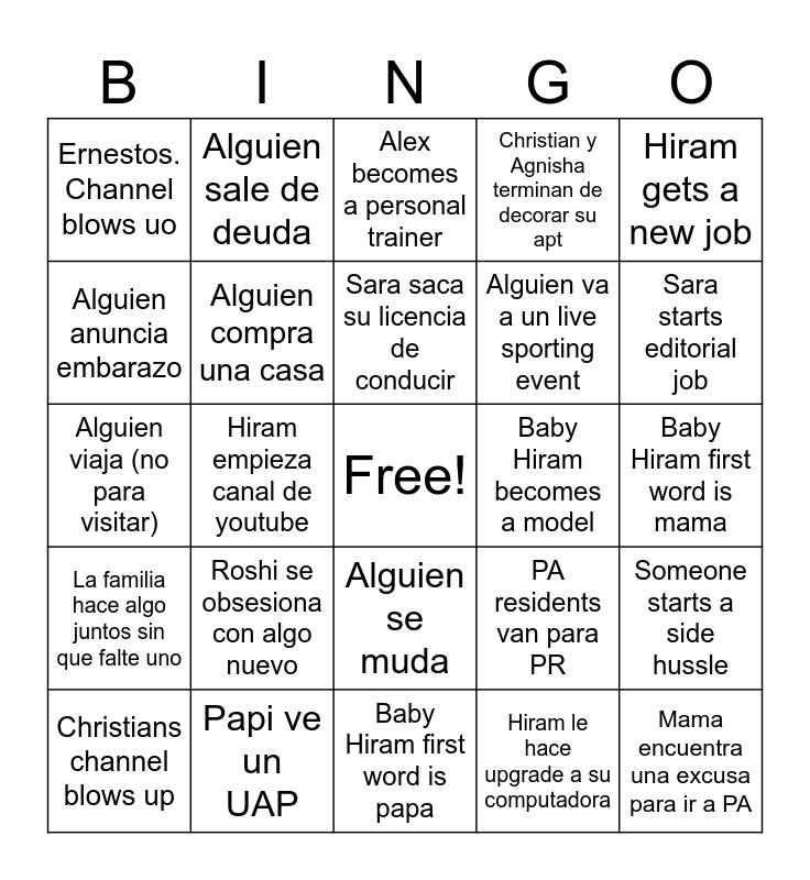 This bingo card has a free space and 24 words: Roshi se obsesiona con algo nuevo, Papi ve un UAP, Sara saca su licencia de conducir, Christians channel blows up, Hiram gets a new job, Ernestos. Channel blows uo, Alguien anuncia embarazo, Alguien sale de deuda, Baby Hiram becomes a model, Alguien se muda, Alguien va a un live sporting event, Alguien viaja (no para visitar), PA residents van para PR, Someone starts a side hussle, Alguien compra una casa, Hiram le hace upgrade a su computadora, Baby Hiram first word is mama, Alex becomes a personal trainer, Sara starts editorial job, Hiram empieza canal de youtube, Mama encuentra una excusa para ir a PA, La familia hace algo juntos sin que falte uno, Christian y Agnisha terminan de decorar su apt and Baby Hiram first word is papa.