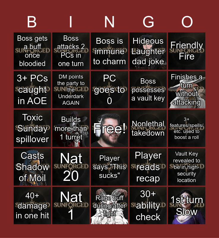 This bingo card has 24 images, a free space and 24 words: Nat 20, Nat 1, PC goes to 0, 40+ damage in one hit, Friendly Fire, Boss gets a buff once bloodied, 3+ PCs caught in AOE, Boss attacks 2 PCs in one turn, Nonlethal takedown, Player says "This sucks", Boss possesses a vault key, Toxic Sunday spillover, Player reads recap, Vault Key revealed to be in high-security location, DM points the party to the Underdark AGAIN, 30+ ability check, 3+ features/spells/ etc. used to boost a roll, Boss is immune to charm, Finishes a turn without attacking, Builds more than 1 turret, 1st turn Slow, Casts Shadow of Moil, Hideous Laughter dad joke and Rage buff during/after fight.