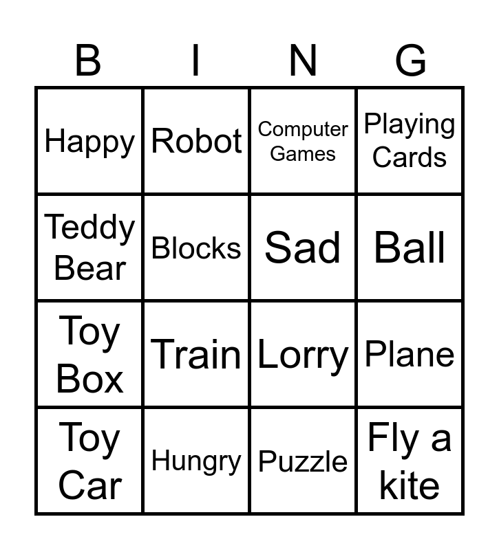 This bingo card has 23 words: Fly a kite, Marbles, Ball, Thirsty, Teddy Bear, Happy, Blocks, Robot, Toy Car, Button, Train, Toy Box, Board Game, Chess, Hungry, Balloon, Computer Games, Lorry, Sad, Plane, Playing Cards, Puzzle and Doll.