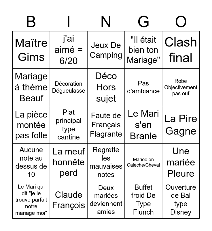 This bingo card has 25 words: Aucune note au dessus de 10, Claude François, Faute de Français Flagrante, Buffet froid De Type Flunch, Clash final, Maître Gims, j'ai aimé = 6/20, Jeux De Camping, Le Mari s'en Branle, Une mariée Pleure, Mariage à thème Beauf, Décoration Dégueulasse, Deux mariées deviennent amies, Mariée en Calèche/Cheval, Robe Objectivement pas ouf, Le Mari qui dit "je le trouve parfait notre mariage moi", Plat principal type cantine, Déco Hors sujet, Pas d'ambiance, La Pire Gagne, La pièce montée pas folle, La meuf honnête perd, Regrette les mauvaises notes, "Il était bien ton Mariage" and Ouverture de Bal type Disney.
