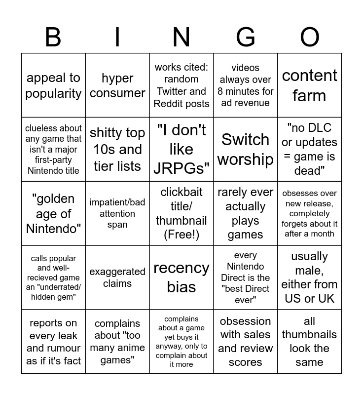 This bingo card has a free space and 24 words: exaggerated claims, complains about "too many anime games", "I don't like JRPGs", reports on every leak and rumour as if it's fact, content farm, appeal to popularity, clueless about any game that isn't a major first-party Nintendo title, hyper consumer, rarely ever actually plays games, recency bias, Switch worship, "golden age of Nintendo", every Nintendo Direct is the "best Direct ever", usually male, either from US or UK, shitty top 10s and tier lists, obsession with sales and review scores, obsesses over new release, completely forgets about it after a month, works cited: random Twitter and Reddit posts, "no DLC or updates = game is dead", impatient/bad attention span, all thumbnails look the same, calls popular and well-recieved game an "underrated/ hidden gem", videos always over 8 minutes for ad revenue and complains about a game yet buys it anyway, only to complain about it more.