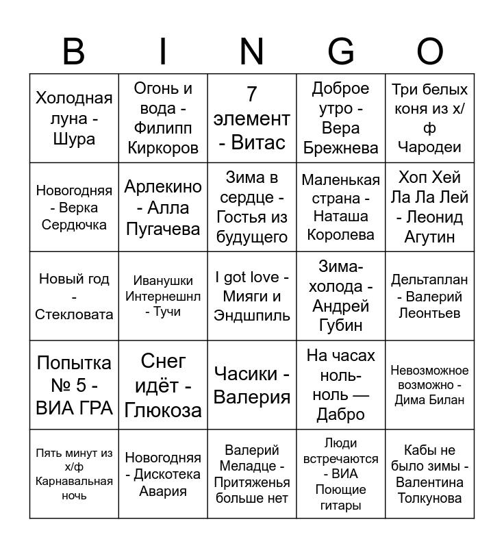 This bingo card has a free space and 24 words: Снег идёт - Глюкоза, Новогодняя - Дискотека Авария, Зима в сердце - Гостья из будущего, Пять минут из х/ф Карнавальная ночь, Три белых коня из х/ф Чародеи, Холодная луна - Шура, Новогодняя - Верка Сердючка, Огонь и вода - Филипп Киркоров, Зима-холода - Андрей Губин, Часики - Валерия, Маленькая страна - Наташа Королева, Новый год - Стекловата, На часах ноль-ноль — Дабро, Невозможное возможно - Дима Билан, Арлекино - Алла Пугачева, Люди встречаются - ВИА Поющие гитары, Дельтаплан - Валерий Леонтьев, 7 элемент - Витас, Хоп Хей Ла Ла Лей - Леонид Агутин, Иванушки Интернешнл - Тучи, Кабы не было зимы - Валентина Толкунова, Попытка № 5 - ВИА ГРА, Доброе утро - Вера Брежнева and Валерий Меладце - Притяженья больше нет.