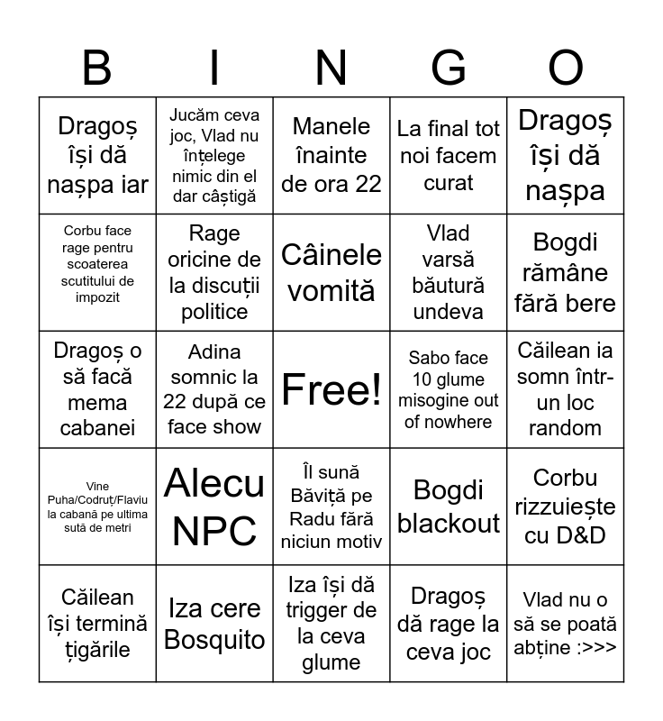 This bingo card has a free space and 24 words: Alecu NPC, Iza cere Bosquito, Câinele vomită, Căilean își termină țigările, Dragoș își dă nașpa, Dragoș își dă nașpa iar, Corbu face rage pentru scoaterea scutitului de impozit, Jucăm ceva joc, Vlad nu înțelege nimic din el dar câștigă, Sabo face 10 glume misogine out of nowhere, Îl sună Băviță pe Radu fără niciun motiv, Vlad varsă băutură undeva, Dragoș o să facă mema cabanei, Bogdi blackout, Corbu rizzuiește cu D&D, Rage oricine de la discuții politice, Dragoș dă rage la ceva joc, Căilean ia somn într-un loc random, Manele înainte de ora 22, Bogdi rămâne fără bere, Adina somnic la 22 după ce face show, Vlad nu o să se poată abține :>>>, Vine Puha/Codruț/Flaviu la cabană pe ultima sută de metri, La final tot noi facem curat and Iza își dă trigger de la ceva glume.