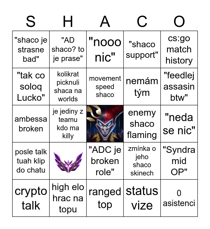 This bingo card has 1 images, a free space and 23 words: high elo hrac na topu, movement speed shaco, crypto talk, cs:go match history, "shaco je strasne bad", "tak co soloq Lucko", "AD shaco? to je prase", enemy shaco flaming, "ADC je broken role", nemám tým, ambessa broken, zmínka o jeho shaco skinech, "Syndra mid OP", kolikrat picknuli shaca na worlds, status vize, "neda se nic", "nooo nic", "feedlej assasin btw", je jediny z teamu kdo ma killy, 0 asistenci, posle talk tuah klip do chatu, "shaco support" and ranged top.