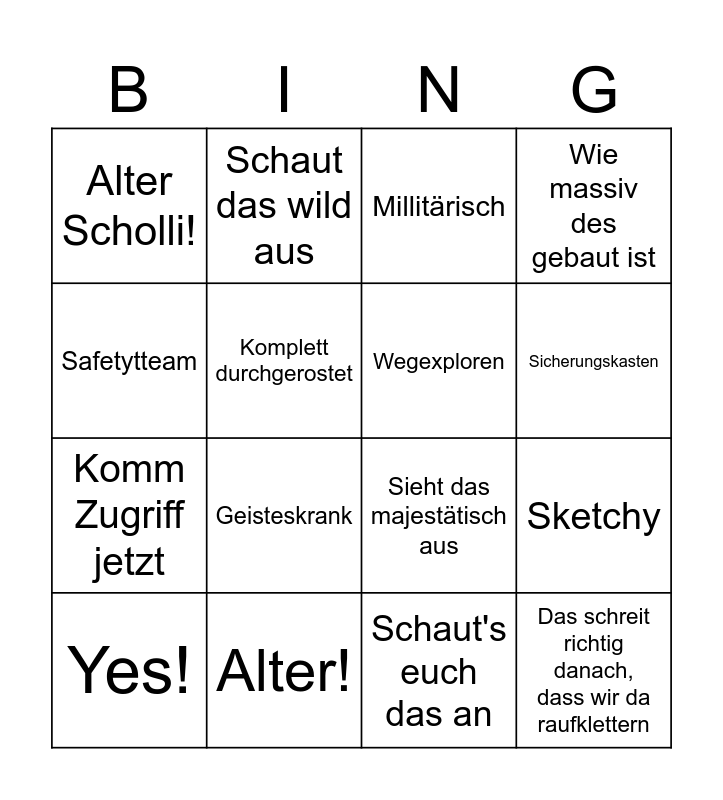 This bingo card has 16 words: Alter!, Sketchy, Millitärisch, Alter Scholli!, Komm Zugriff jetzt, Schaut das wild aus, Sieht das majestätisch aus, Schaut's euch das an, Safetytteam, Komplett durchgerostet, Yes!, Wie massiv des gebaut ist, Geisteskrank, Sicherungskasten, Wegexploren and Das schreit richtig danach, dass wir da raufklettern.