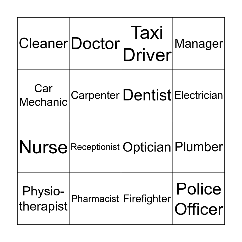 This bingo card has 24 words: Traffic Warden, Chef, Electrician, Shop Assistant, Car Mechanic, Cleaner, Carpenter, Doctor, Pharmacist, Engineer, Nurse, Optician, Paramedic, Waiter, Dentist, Driving Instructor, Firefighter, Taxi Driver, Receptionist, Plumber, Physio-therapist, Police Officer, Manager and Waitress.
