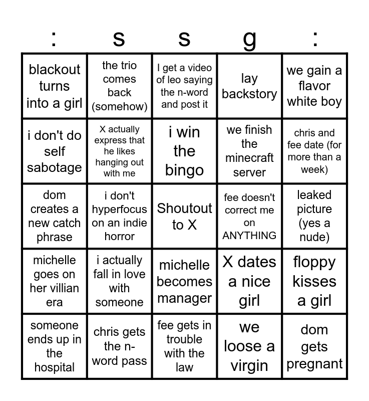 This bingo card has a free space and 24 words: i actually fall in love with someone, chris gets the n-word pass, i win the bingo, someone ends up in the hospital, we gain a flavor white boy, blackout turns into a girl, i don't do self sabotage, the trio comes back (somehow), fee doesn't correct me on ANYTHING, michelle becomes manager, we finish the minecraft server, dom creates a new catch phrase, X dates a nice girl, floppy kisses a girl, X actually express that he likes hanging out with me, we loose a virgin, leaked picture (yes a nude), I get a video of leo saying the n-word and post it, chris and fee date (for more than a week), i don't hyperfocus on an indie horror, dom gets pregnant, michelle goes on her villian era, lay backstory and fee gets in trouble with the law.