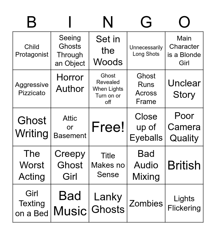 This bingo card has a free space and 45 words: Mysterious Phone Call, Lights Flickering, Main Character Goes to Check What's Happening, Girl Texting on a Bed, Big House, Zombies, Set in the Woods, Watching an Old Movie, Main Character is a Blonde Girl, Bad Music, Unnecessarily Long Shots, Close up of Eyeballs, Title Makes no Sense, Creepy Ghost Girl, Good Start, Bad Ending, Lanky Ghosts, Bad Effects, Ghost Writing, No Reaction to the Spook, Unclear Story, Seeing Ghosts Through an Object, Super Creepy Dude, Netflix Original Writing, Child Protagonist, Bad Cuts, Poor Camera Quality, Texts on Screen, Pics of Someone Sleeping, Bad Audio Mixing, The Worst Acting, Actually Good, British, Ugly Decor, Asshole Man, Phone Call Not Real, Attic or Basement, Allegory, Someone's Got Their Dogs Out, Scary Child Drawings, Ghost Revealed When Lights Turn on or off, Aggressive Pizzicato, Ghost Runs Across Frame, Cupboards Open, Horror Author and Vine Boom or Similar Meme Sound Effect.