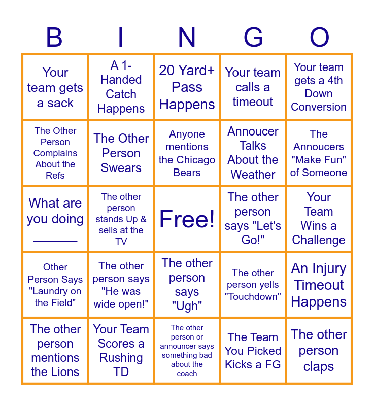 This bingo card has a free space and 29 words: The other person mentions the Lions, Your Team Scores a TD, The other person stands Up & sells at the TV, An "Offside" call happens for the other team, Your team gets a sack, 20 Yard+ Pass Happens, The Other Person Swears, The other person says "He was wide open!", The other person says "Let's Go!", Your Team Scores a Rushing TD, Your Team Wins a Challenge, The other person claps, The other person or announcer says something bad about the coach, The Team You Picked Kicks a FG, The Annoucers "Make Fun" of Someone, Your team does a "celebration", The other person says "Ugh", Other Person Says "Laundry on the Field", Your team gets a 4th Down Conversion, What are you doing ______, The other person yells "Touchdown", Your Team Gets an Interception, Annoucer Talks About the Weather, The Other Person Complains About the Refs, Your team calls a timeout, A 1-Handed Catch Happens, An Injury Timeout Happens, Anyone mentions the Chicago Bears and The "Playoffs" Are Mentioned.