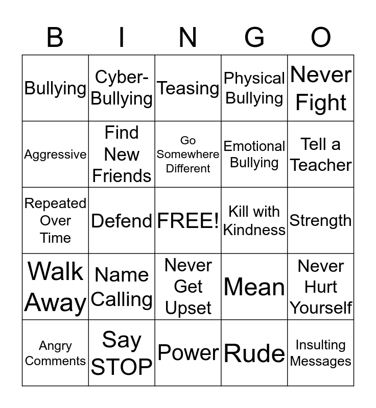 This bingo card has a free space and 24 words: Name Calling, Say STOP, Go Somewhere Different, Angry Comments, Never Fight, Bullying, Aggressive, Cyber- Bullying, Kill with Kindness, Never Get Upset, Emotional Bullying, Repeated Over Time, Mean, Never Hurt Yourself, Find New Friends, Rude, Strength, Teasing, Tell a Teacher, Defend, Insulting Messages, Walk Away, Physical Bullying and Power.