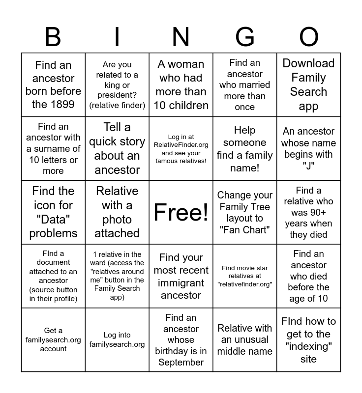 This bingo card has a free space and 24 words: 1 relative in the ward (access the "relatives around me" button in the Family Search app), Log into familysearch.org, Log in at RelativeFinder.org and see your famous relatives!, Get a familysearch.org account, Download Family Search app, Find an ancestor born before the 1899, Find an ancestor with a surname of 10 letters or more, Are you related to a king or president?(relative finder), Change your Family Tree layout to "Fan Chart", Find your most recent immigrant ancestor, Help someone find a family name!, Find the icon for "Data" problems, Find movie star relatives at "relativefinder.org", Find an ancestor who died before the age of 10, Tell a quick story about an ancestor, Relative with an unusual middle name, Find a relative who was 90+ years when they died, A woman who had more than 10 children, An ancestor whose name begins with "J", Relative with a photo attached, FInd how to get to the "indexing" site, FInd a document attached to an ancestor (source button in their profile), Find an ancestor who married more than once and Find an ancestor whose birthday is in September.
