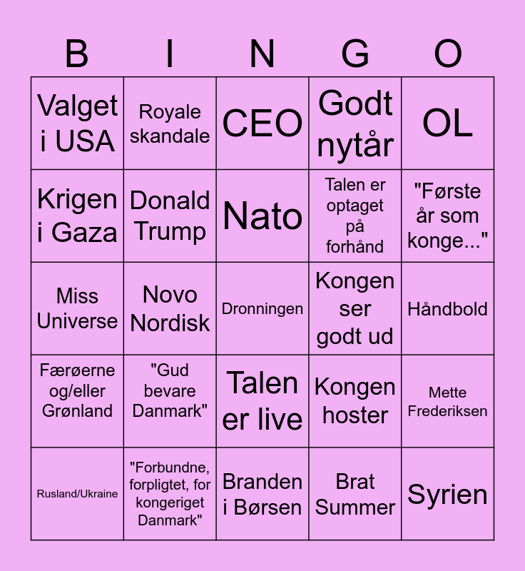 This bingo card has a free space and 24 words: "Gud bevare Danmark", "Forbundne, forpligtet, for kongeriget Danmark", Nato, Rusland/Ukraine, OL, Valget i USA, Krigen i Gaza, Royale skandale, Kongen ser godt ud, Talen er live, Talen er optaget på forhånd, Miss Universe, Kongen hoster, Mette Frederiksen, Donald Trump, Brat Summer, Håndbold, CEO, "Første år som konge...", Novo Nordisk, Syrien, Færøerne og/eller Grønland, Godt nytår and Branden i Børsen.