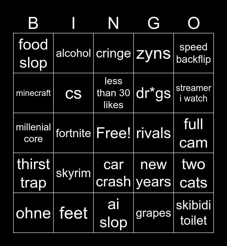 This bingo card has a free space and 24 words: skyrim, feet, less than 30 likes, ohne, speed backflip, food slop, minecraft, alcohol, rivals, car crash, dr*gs, millenial core, new years, two cats, cs, grapes, full cam, cringe, streamer i watch, fortnite, skibidi toilet, thirst trap, zyns and ai slop.