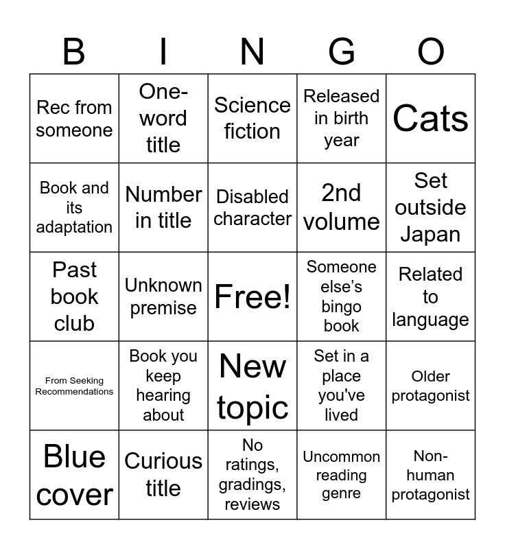 This bingo card has a free space and 25 words: Book you keep hearing about, No ratings, gradings, reviews, Disabled character, Blue cover, Cats, Rec from someone, Book and its adaptation, One-word title, Someone else’s bingo book, New topic, 2nd volume, Past book club, Set in a place you've lived, Older protagonist, Number in title, New Natively level, Related to language, Science fiction, Set outside Japan, Unknown premise, Non-human protagonist, Curious title, From Seeking Recommendations, Released in birth year and Uncommon reading genre.