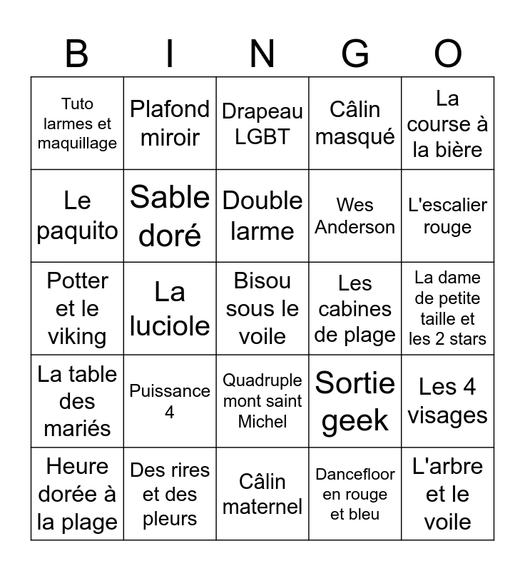 This bingo card has 100 words: Ne pas s'asseoir, Café Jeannine, La dame de petite taille et les 2 stars, Le cortège alsacien, Le gendarme qui pleure, Hitchcock et la main, La tête de lit, La portière de la voiture, La balle et le ballon, Le discours sous la tente, La mariée, le miroir et le papa, La diagonale dans la pelouse, La pizza de Martin Parr, Des rires et des pleurs, Câlin à trois, Accident de voiture, Wes Anderson, Maquillage rigolo, Les deux amoureux qui marchent, 1 scene 3 ambiances, Le brossage de dents, Fou rire et tapisserie, Après le discours, La larme, La brochette rouge et verte, Les cabines de plage, La course à la bière, Sortie geek, L'explosion, Le miroir et le kodak, La luciole, Tuto larmes et maquillage, Le mouchoir et la main, Câlin celtique, Dancefloor en rouge et bleu, Double larme, Les 4 visages, Le chapeau et la tétine, La culotte, L'arbre et le voile, Visio post-ceremonie, Les pleureuses, Potter et le viking, Le skate, L'escalier rouge, Drapeau LGBT, Le Louvre, Les bubulles, La prière de la mariée, Câlin maternel, Les chaises qui discutent, L'asiatique dans le verre, Photo bomb enfantin, Les aurores boréales, La culotte et l'escabeau, L'écrasage de gamin, Le foot, Le palais des congrès, Le smile, Câlin masqué, Fou rire et champagne, Pétanque et chien, Les pigeons, La lettre, Les amoureux de la bibliothèque, Les 3 arbres, Le mont saint Michel, Le saut d'Emilie, Visio Nouvelle Calédonie, Le gymnase, La ronde du bouquet, Puissance 4, L'escalier et le mur bleu (pas bleu), Bisou et orgues, Le bouquet et les mains, Le toboggan rouge, Première danse à travers la vitre, Le paquito, Première danse en reflet, Le triangle de la philharmonie, Heineken, Bisou sous le voile, Jenga géant, Quadruple mont saint Michel, Le métro, Plafond miroir, Gâteau blanc, mur bleu et lustres jaunes, Lustres ronds et silhouette bleue, Sous la pluie, La table des mariés, Sur les toits de Paris, Première danse en noir et blanc, Double couple, Heure dorée à la plage, Sable doré, Parasol rouge et chien, Bisou d'invitées, Enfants sur la pelouse, Trou normand and First look en reflet.